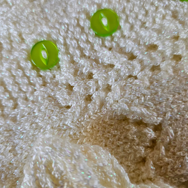This hand-knitted cream GLITTER wool cardigan with green buttons is ready to be made extra special with embroidery.